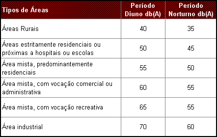 A ABNT estabelece, através da norma NBR 10151, limites máximos de ruídos para as cidades, de acordo com os tipos de áreas. A NBR 10151 especifica um método para a medição de ruído, a aplicação de correções nos níveis medidos se o ruído apresentar características especiais e uma comparação dos níveis corrigidos com um critério que leva em conta vários fatores: